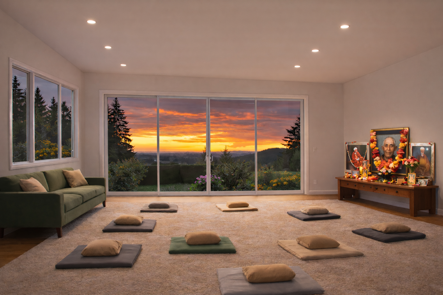 The space will be divided into two parts. One will be a large meditation hall with big windows and a sliding door that opens to the views and land. It will be a place where we can meditate together, practice yoga, listen to and watch Swamiji’s lectures, share meals, and sit in discussion and stillness. A small bathroom will also be included.